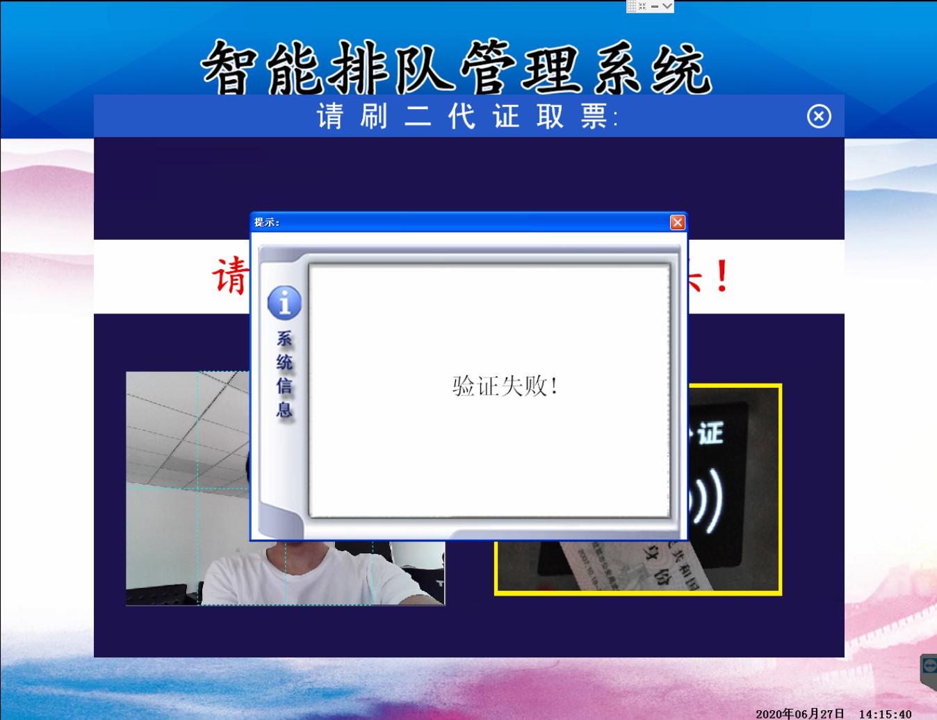5、若“人臉”和“身份證”不是同一個人,或者相差很大,則系統會提示“驗證失敗”將不會打印出票號。
